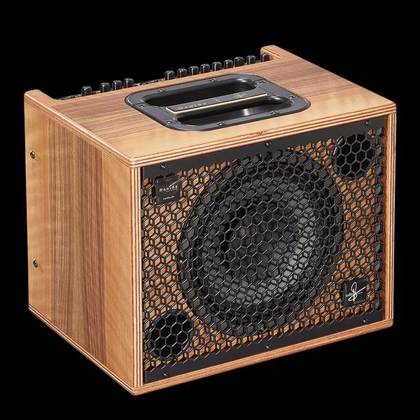 Dieser Akustikgitarrenverstärker entstand in der Zusammenarbeit aus dem einstigen AER-Gründer Udo Rösner und dem Gitarrenbauer Armin Hanika. Mit wenigen Einstellungen erziele ich am Verstärker einen natürlichen warmen Akustik-Sound für meine Hanika-Gitarre mit Piezo-Pickups und dem Instrumenten-Mikrofon Countryman 12 (H10XLR) von Baumann Audio.